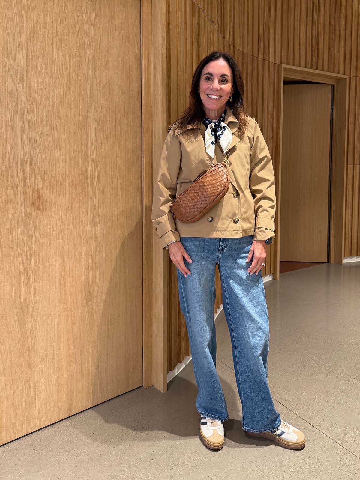 cropped trench (Abercrombie & Fitch–sorry sold out but Mango has a similar one) • scarf (on sale!) • Quince crossbody (looks to be sold out–this is similar) • Quince wide leg jeans I have these too in the shorter inseam • Adidas platform sole