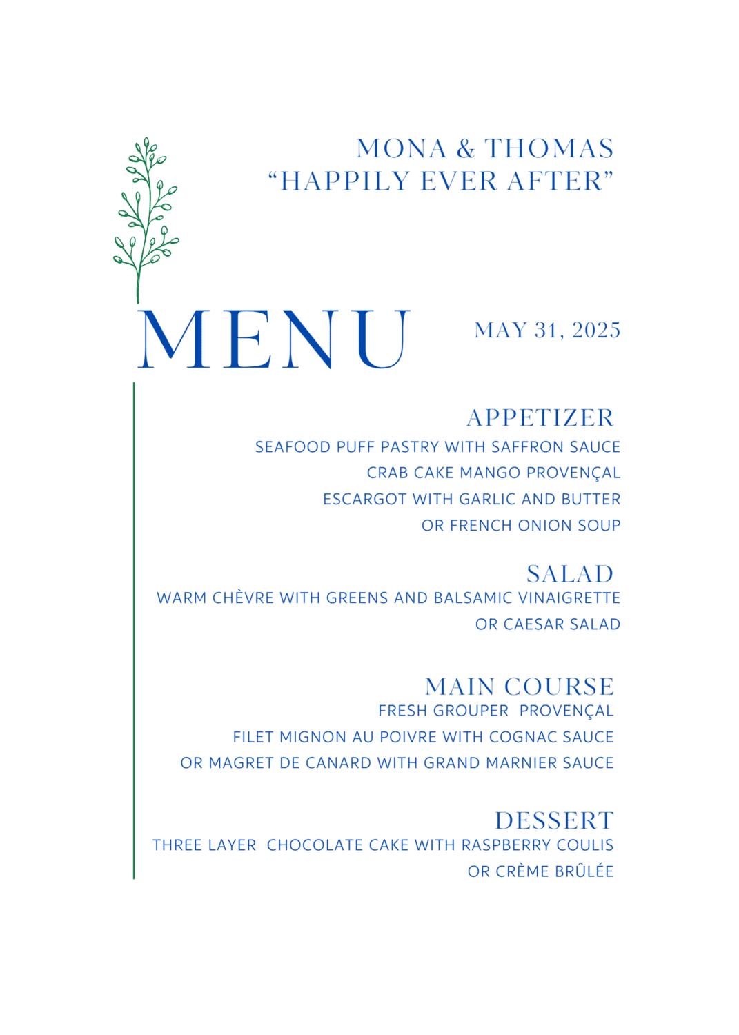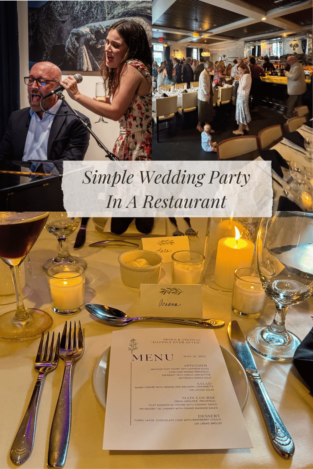 Bravo Mary Ann, perfect selections all around. Your simple Canva menu design also perfection. Both my sons were married at resorts for traveling family and friends and they were productions but really wonderful too. It’s all about the couple and guests, and a venue like yours took it to next level. Best wishes to the new Mr. And Mrs.
