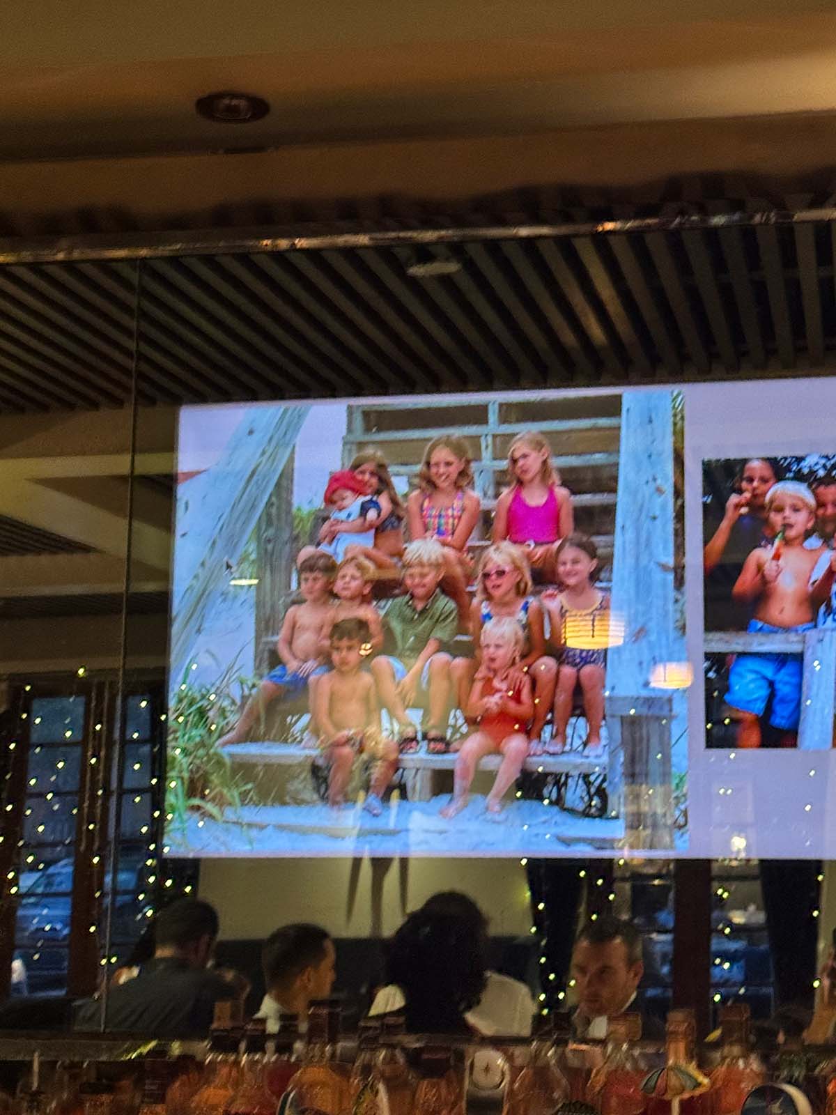 Using Canva again, I made a three minute slide show of the couple (and their buddies) that we looped (thanks to my son-in-law, Luca). The monitor was over the bar in the mirror and played throughout the party.
