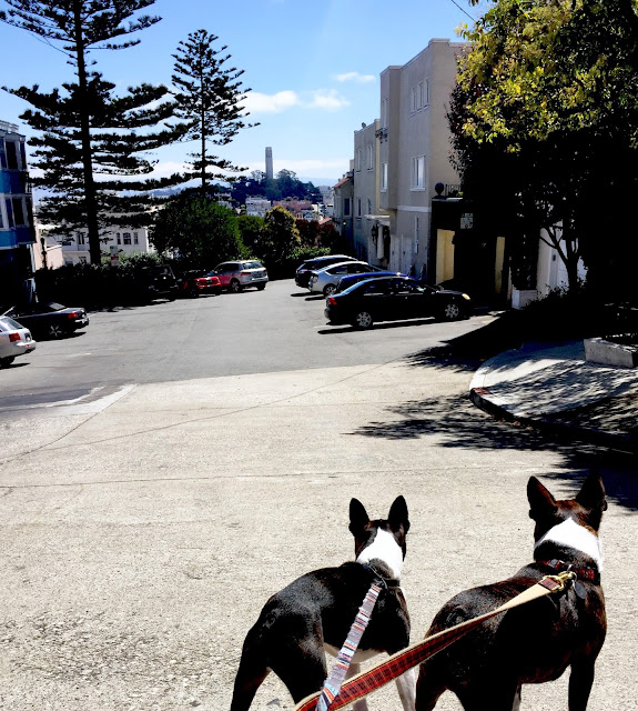 Which is almost true, except that each one has his own idea of where he wants to walk. And Judge (a suburb dog) is teaching Chief to bark at elevator sounds (not cool in an apartment). But Judge (the bigger one) is calmer, sweet natured and likes affection. We will miss him when he goes back to San Diego.
