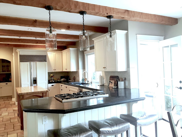 In my client’s rustic modern kitchen we added these Katie Pendants with Cylinders (with glass that doesn’t obstruct her view of the family room).