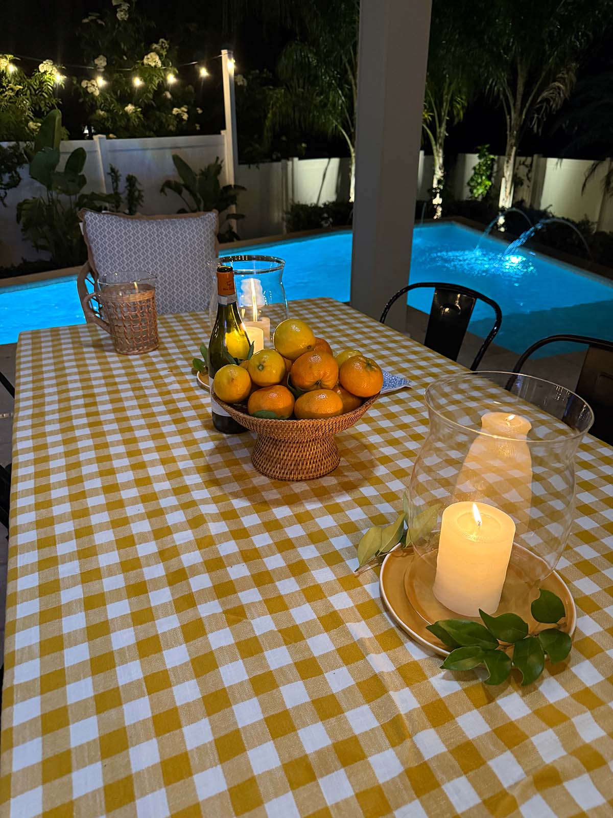 Mary Ann! You always set a beautiful table with color in the best possible ways! I love your collection of glassware that always adds something special to the table. The woven footed bowl with citrus and leaves is gorgeous with the yellow checked cloth. And I never would think to spray the table legs and chairs an hour before sitting down. That is so smart!