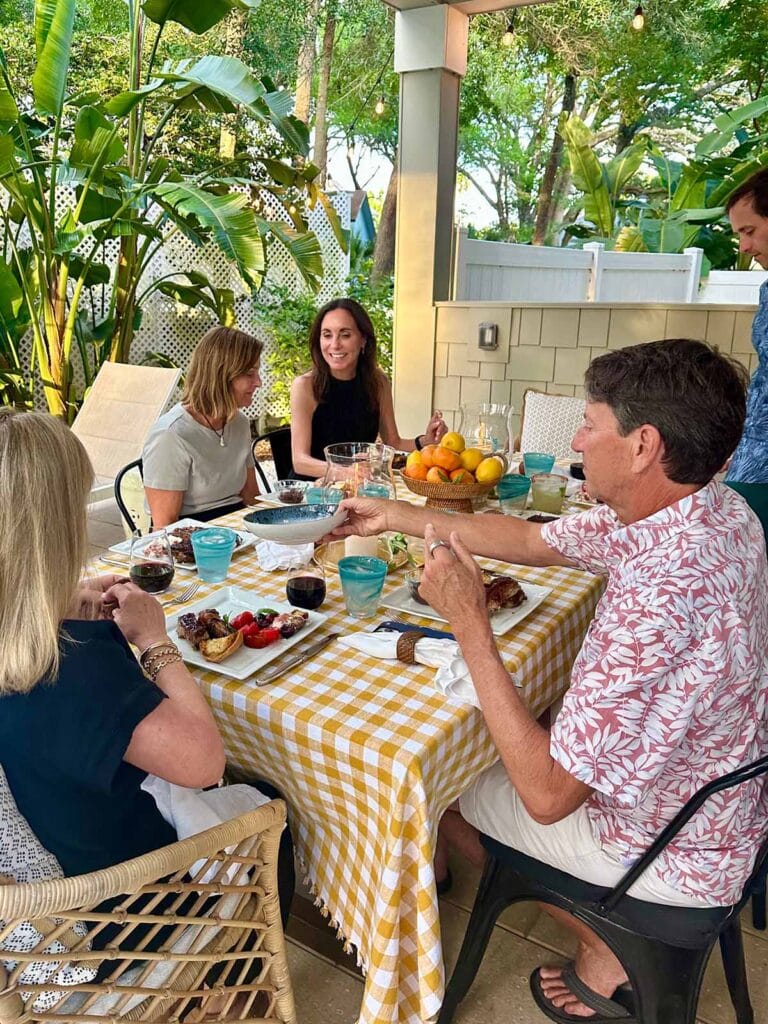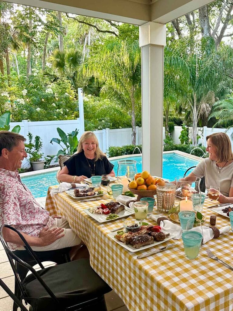 Dining alfresco adds a touch of relaxation and some fresh air to any meal. Like the small dinner party we had recently on our back patio with our friends, Mercedes, Mark, Joy, Tony and our son, Tommy and daughter-in-law, Mona.