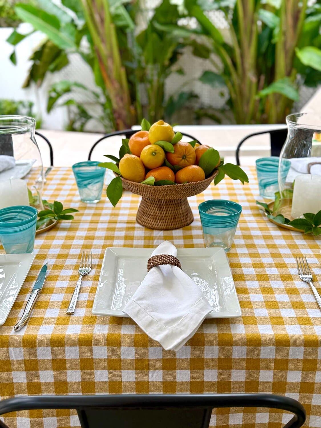 - Centerpiece: A simple arrangement of fresh citrus in a wicker bowl from Amazon. I actually just brought this fruit bowl out here from the kitchen counter. A little tip is to add fresh greenery by clipping leaves (like from our lemon tree).