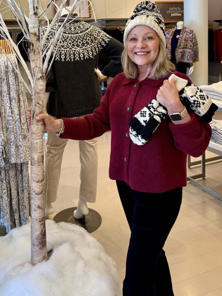 Love the outfits Mary Ann. Do you have the cranberry boucle cardigan? You mention a regular small rather than petite size. Just wondering why? I’m 5’0 and short-waisted—wondering if I should go with regular or petite? I haven’t purchased from J Jill in a few years. I was a 6 petite usually and their small Petites covered 6 or 8:which would make them roomy and look dowdy. The x-small petite are 2-4 and would be too small. I guess I was in between their sizing. I would like to give them another try. I have lost some weight and more like a 4 petite now so maybe the x-small would work. What color are the decorative buttons? What do you think of the snaps rather than actual buttons?