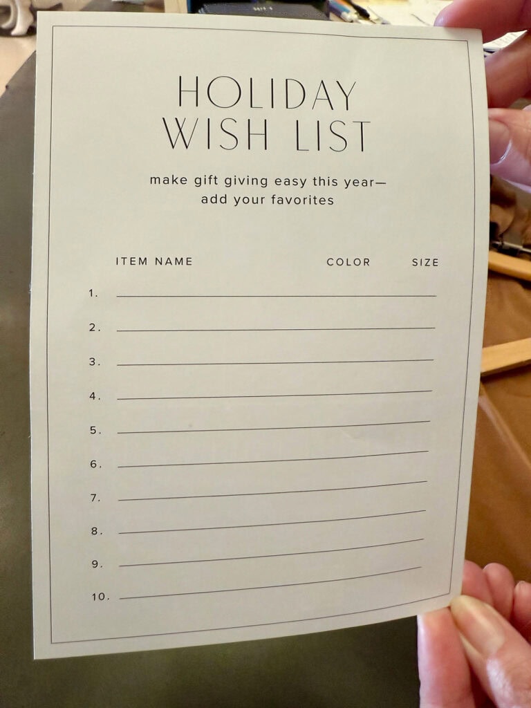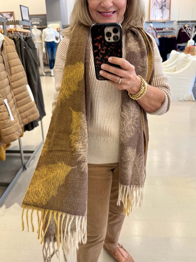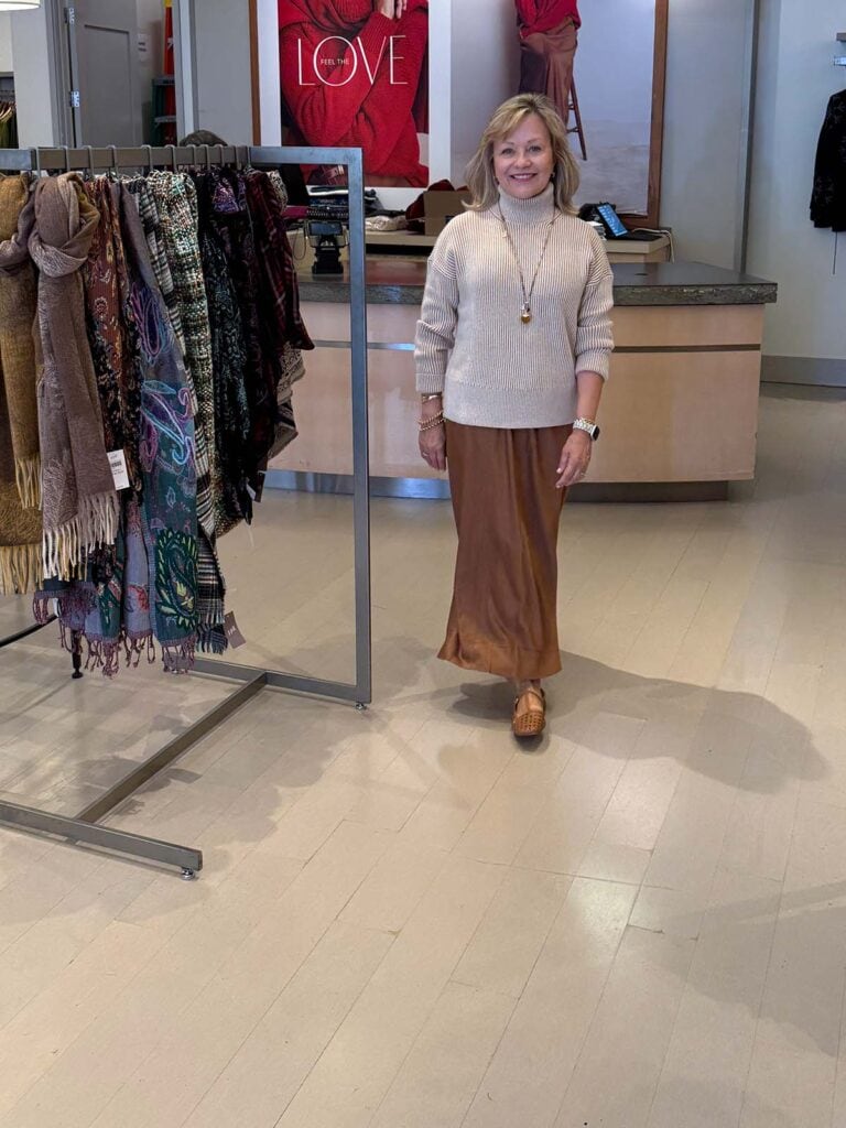 I wanted to buy the cozy leaf scarf that works with the outfit. But I might just hint about it. In fact, if you go into the J. Jill store, they can give to a sheet of paper to record YOUR wish list.