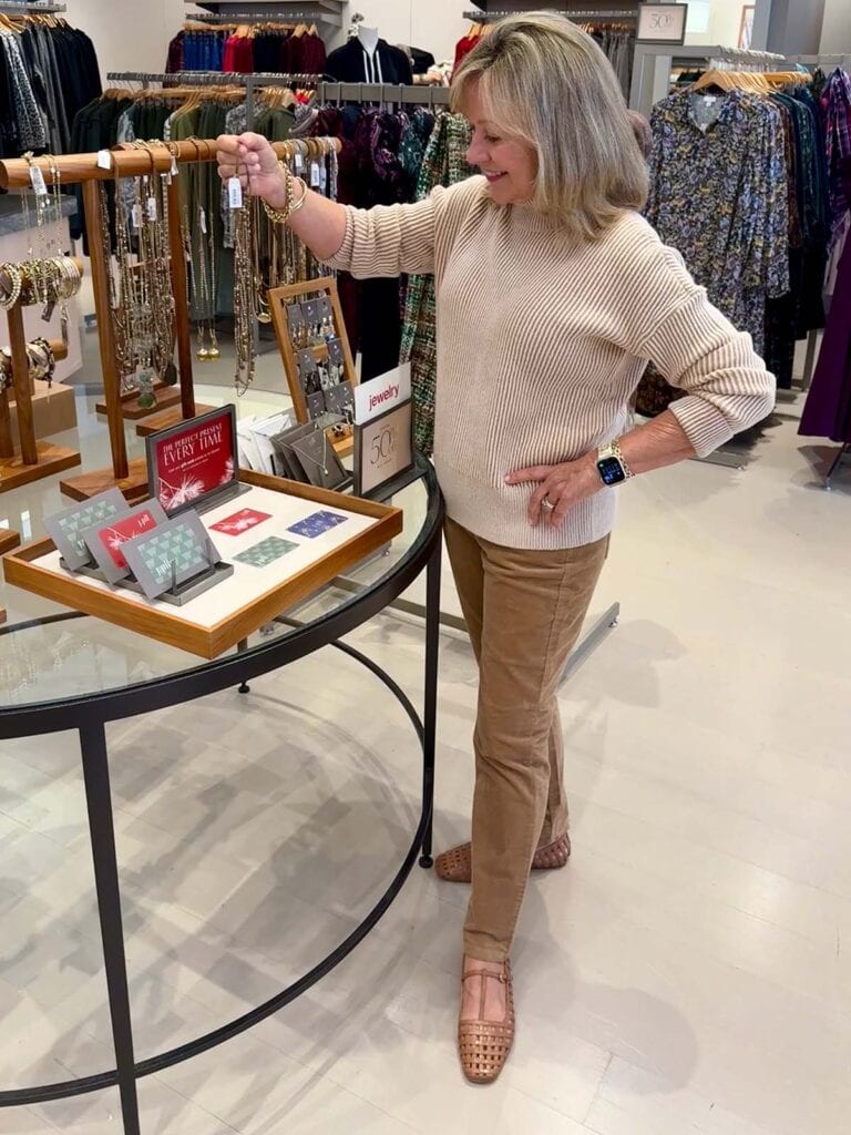 This week, in our local J. Jill store I bought two pairs of flattering corduroy pants to go with two sweaters that J. Jill gifted me recently. I love that J. Jill carries petite (so no hemming for me), tall and plus sizes.