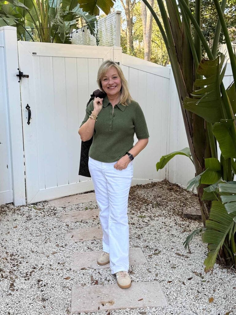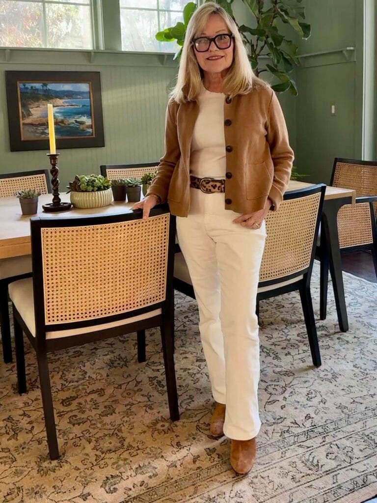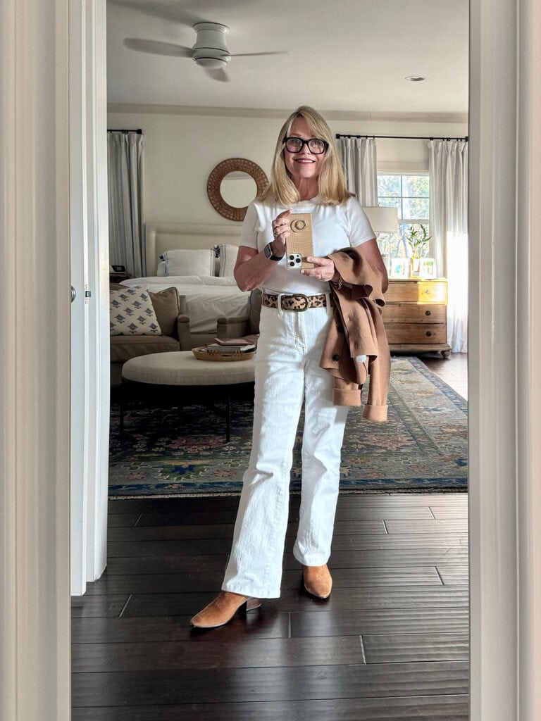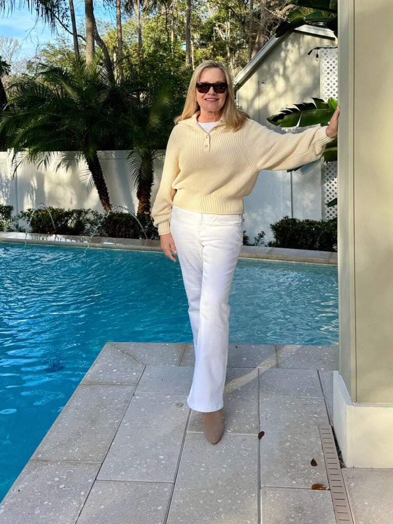 Here are some tips for white jean outfits for the winter months beyond Labor Day. I like white jeans to be a tad looser and definitely not “tight” for a more flattering look.
