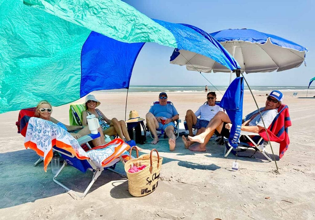 Of course, we needed shade! Mercedes brought the well-priced 6′ blue sun umbrella that screws into the sand. And I brought our easy to carry and install Shibumi wind canopy. We were saying that we needed to do this more often!