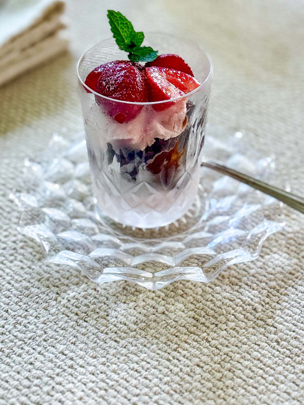 Then, just before serving, I topped them with previously sliced strawberries and some mint from our garden. The fancy glasses make them them seem a little special.