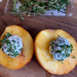 - Take about one tablespoon of the goat cheese and roll it in the thyme leaves and place in the center of the peach.