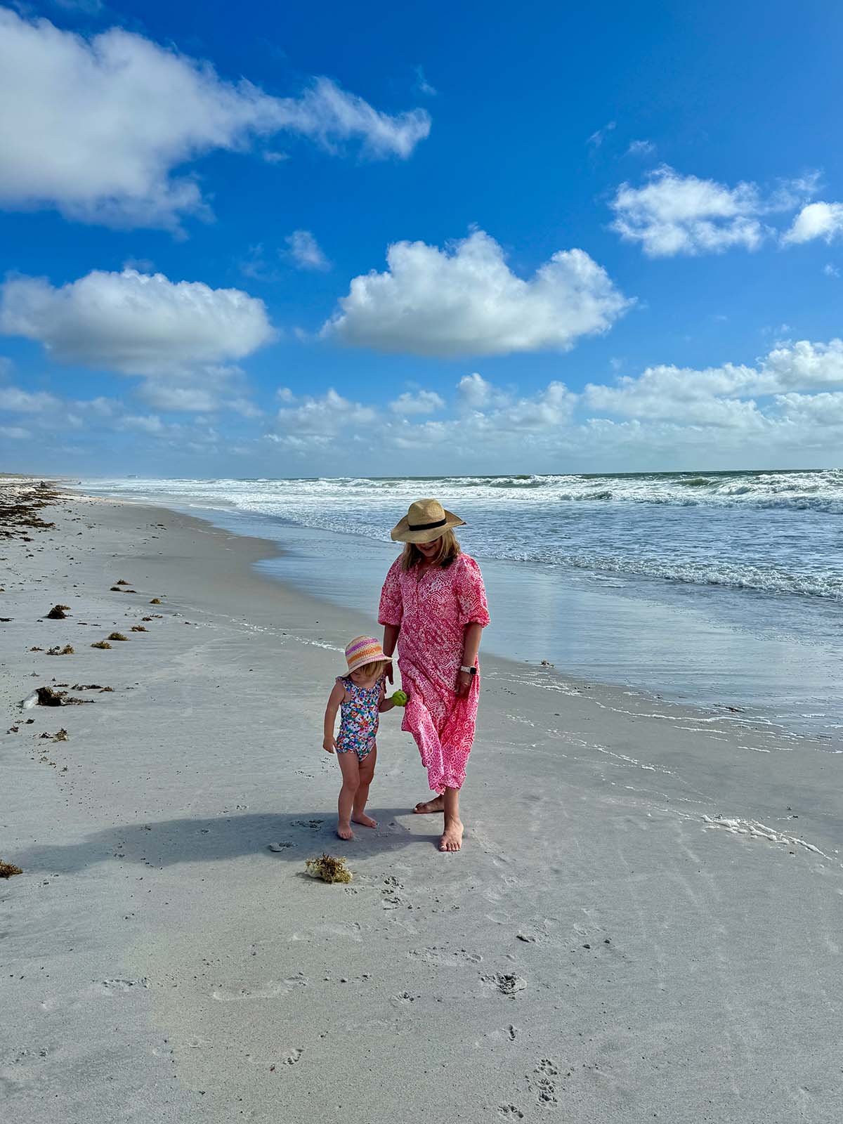You both look so cute and comfy walking the beach hand in hand. I walked the beach this morning, but no little one to share it with!