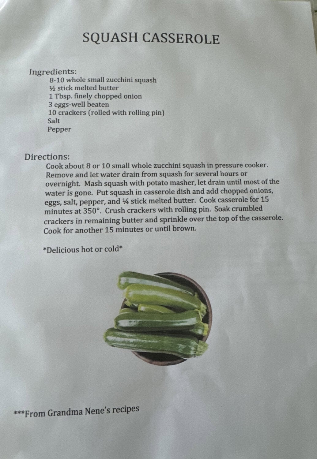 An often requested side dish that she made was her Squash Casserole. Her granddaughter typed out the recipe for it.