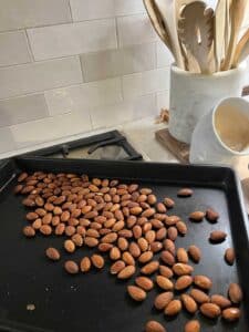 - Spread the almonds out on a baking tray and roast for 10 minutes. Remove from the oven and, once cool enough to handle, roughly chop into 1/4" pieces. Transfer the nuts to a large bowl and add the flours, oats and salt. Mix together and set aside