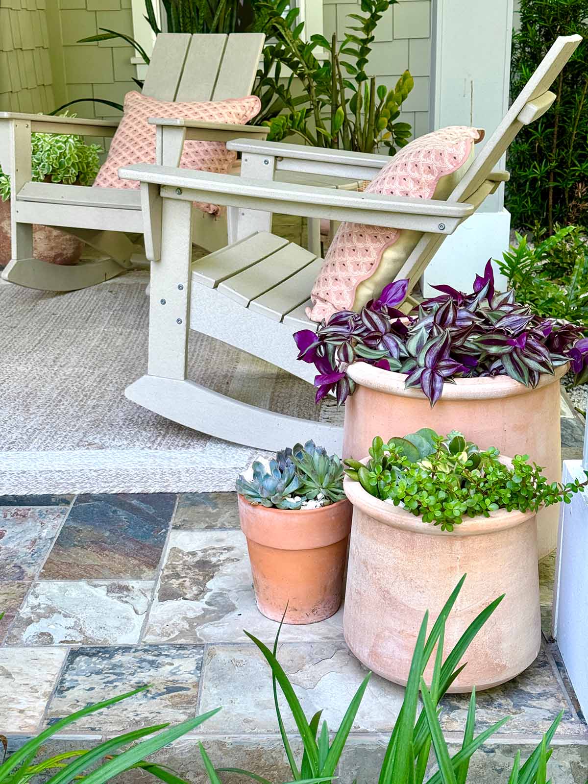 One of the biggest advantages of succulents is their drought tolerance. With as much as we travel, we can’t always water the plants on our porch so these are perfect.