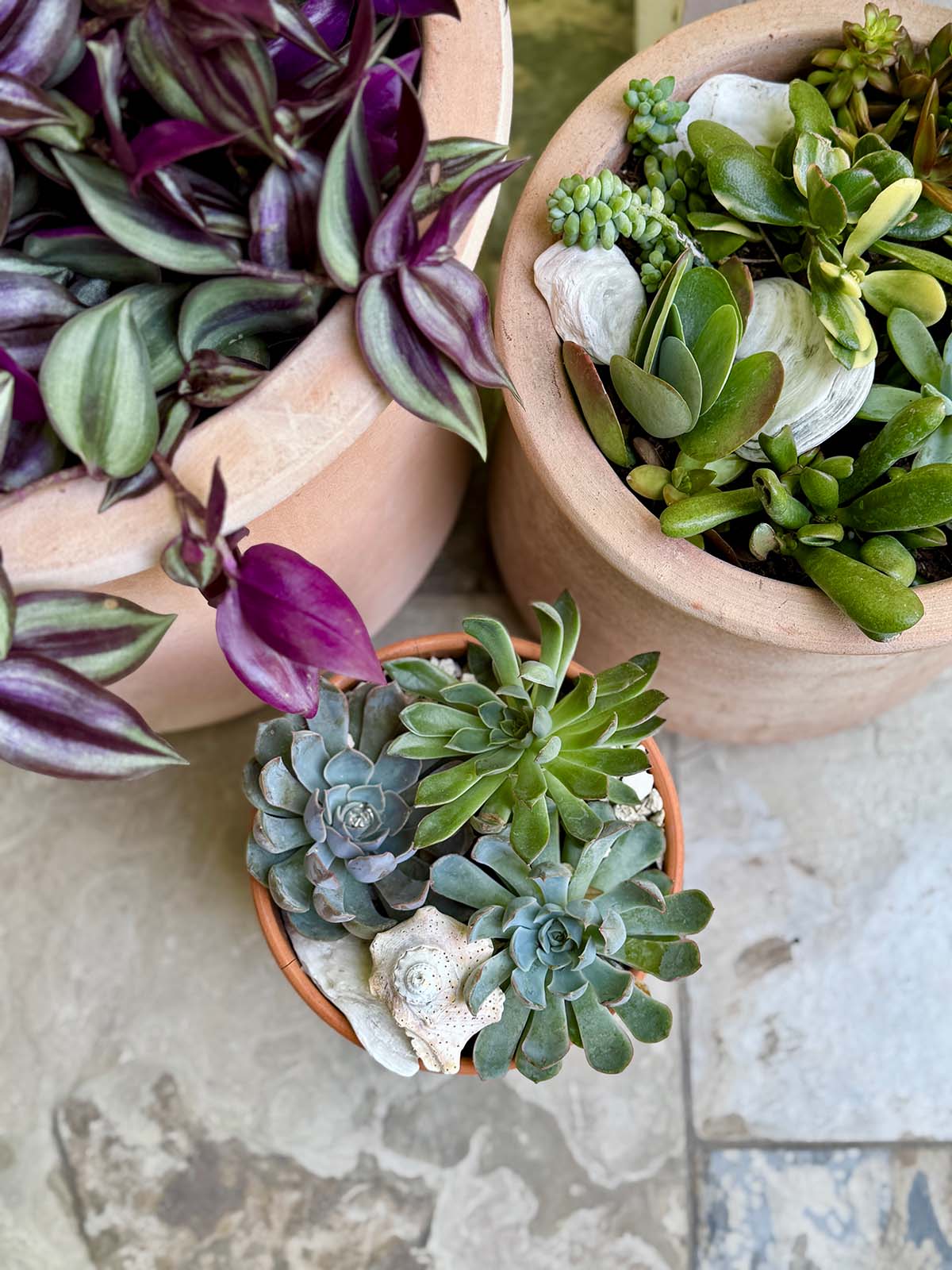 I added pebbles and shells to the containers and I also toss shells that I pick up on the beach onto our gravel pathways.