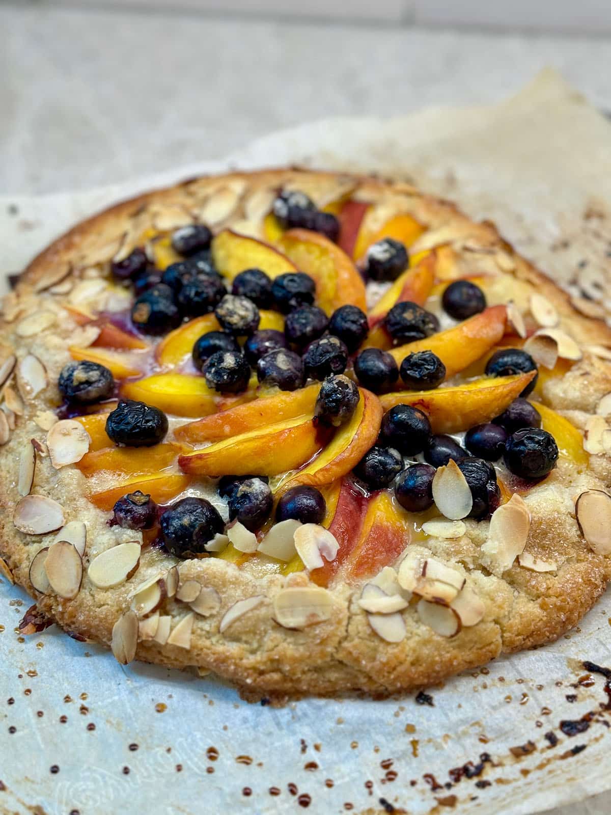 This recipe is delicious with the almond flavors in the flakey crust and in the filling known as frangipane (a creamy, sweet, almond filling). The seasonal peaches and blueberries are juicy and colorful.