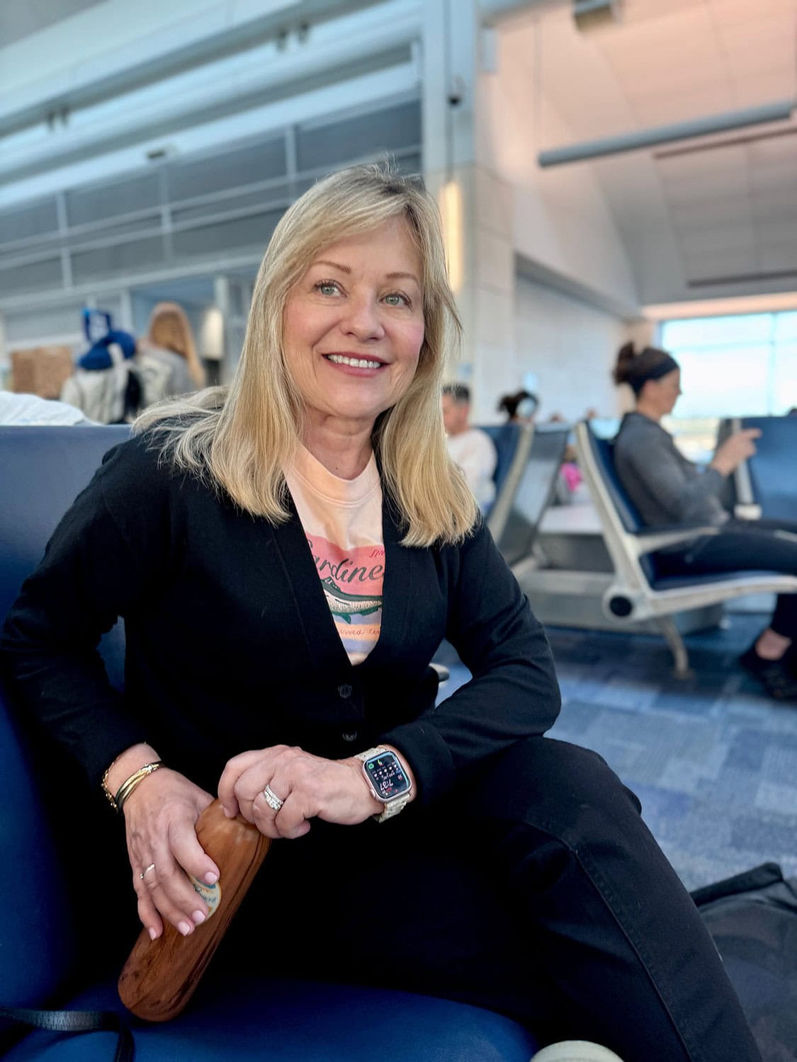 It’s a long day of flying to the west coast to San Diego or Los Angeles from Jacksonville, Florida. We usually have a layover mid-way (like in Houston or Denver). I like to wear clothing with stretch, layers and items I will wear again at the destination.