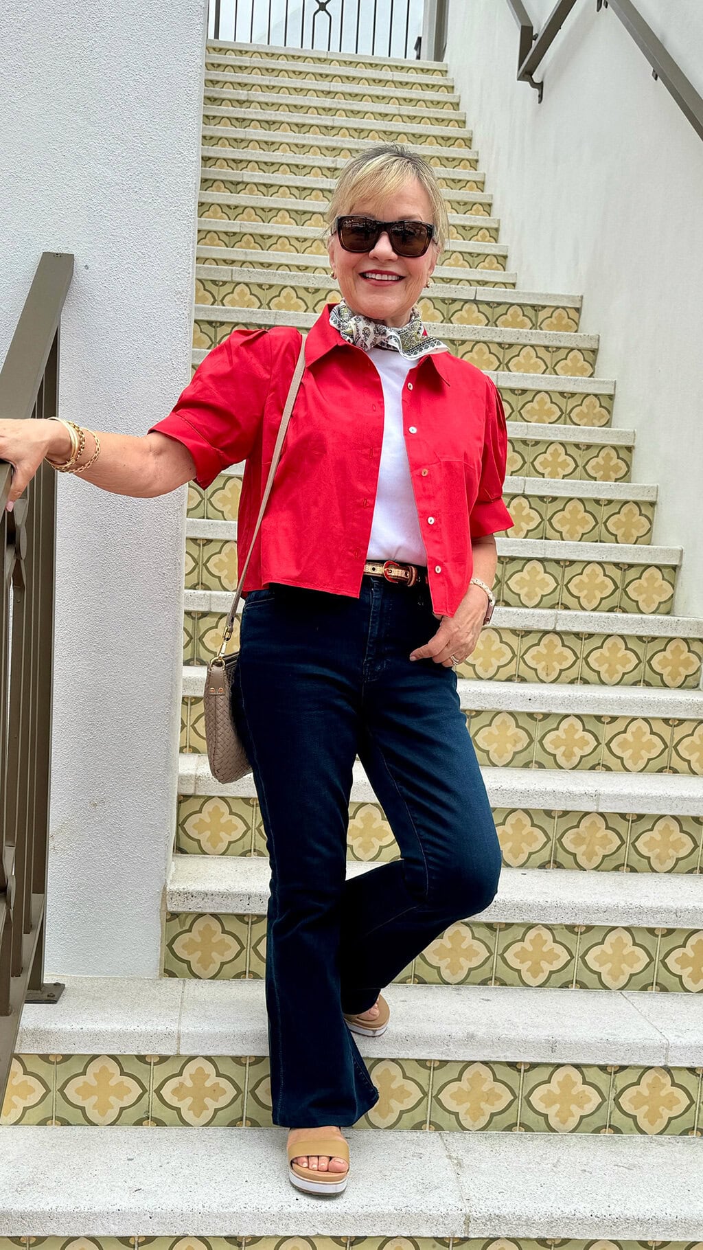 The Quince lightweight leather sandals are really comfortable. Here I am wearing the red top as jacket with Ray Ban sunglasses, a white tee-shirt, slim raffia belt, Madewell bandana (similar) and my favorite Mother jeans (size 27 P). And red Chanel lipstick. The pony tail and red lips are to distract you from how badly I need a hair appointment (it’s next week).