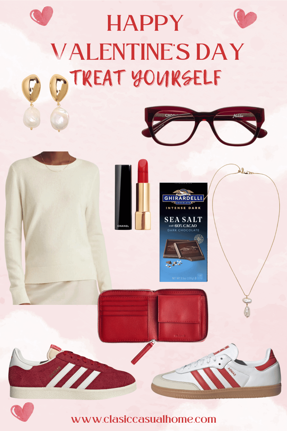 Baroque Pearl Earrings • New Burgundy Readers • Lightweight Cashmere Sweater for $50 (I love mine) • Classic Chanel Lipstick • Ghirardelli Sea Salt Dark Chocolate Bar (my favorite) • Drop Pearl Chain Necklace • Small Red Leather Wallet (easy to spot in your purse and on sale) • Red Suede Or White Leather Adidas To Update Your Blue Jeans