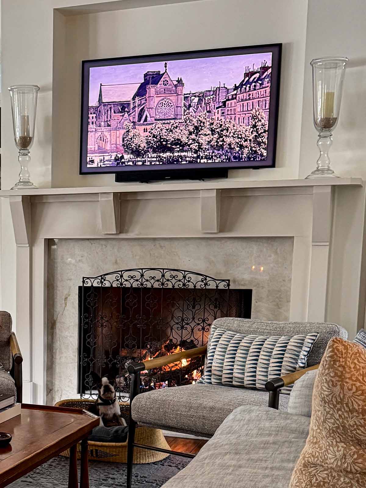 We changed our fireplace from beige tile to a dark gray melange made with abstract tiles. Since we have a gas fireplace, we used gray fireballs instead of the usual logs and, I have to say, it’s absolutely stunning.