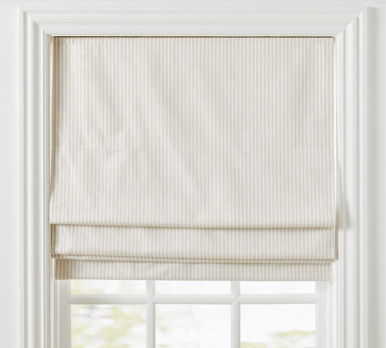 Cloth Roman shades are the tailored choice — fabric that folds up in clean, structured pleats when raised, and lays flat and beautiful when lowered. They sit beautifully inside or outside a window frame and bring a polished, custom feel to a room.