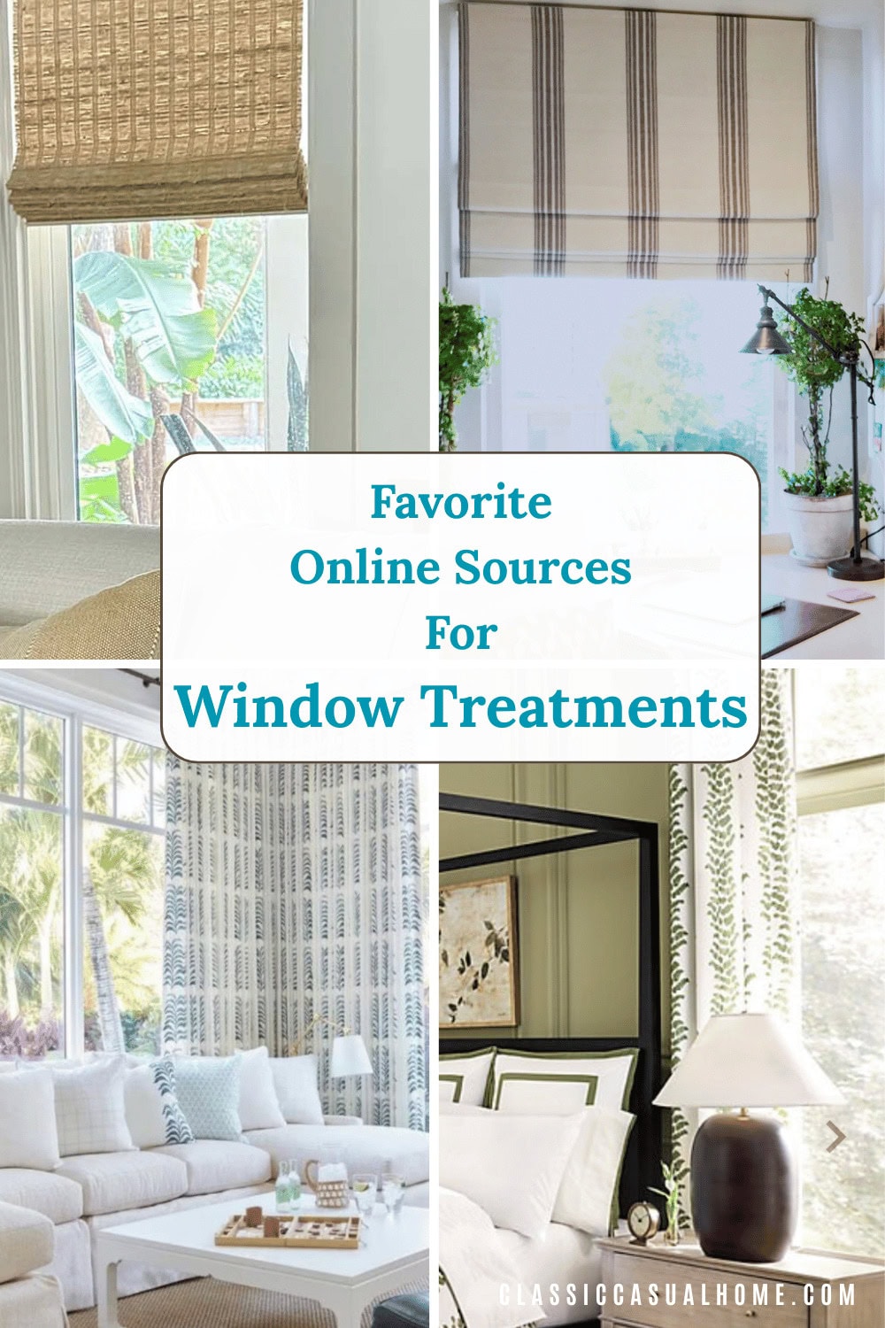 Curtains, woven wood blinds, and cloth Roman shades — the window treatment online sources I use.